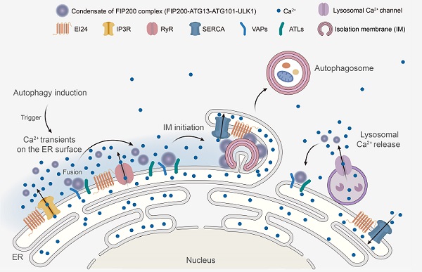 综上,该研究发现在自噬诱导条件下,内质网表面发生的钙瞬变诱导自噬起始FIP200复合物发生液-液相分离。然后FIP200凝聚体与内质网膜蛋白VAPs和ATLs结合并稳定定位于内质网上,成为自噬起始位点。该工作揭示了内质网表面钙瞬变是决定自噬体在内质网上形成的关键信号,极大地促进了我们对多细胞生物自噬分子机制的理解。