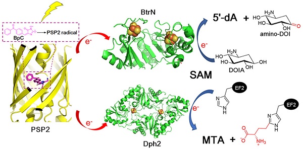 研究发现光激发的PSP2蛋白可以产生强还原能力的PSP2自由基,从而还原SAM自由基酶BtrN的活性铁硫簇。同时,实验表明PSP2可以还原BtrN的辅助[4Fe-4S]簇,该辅助[4Fe-4S]簇在目前已知SAM自由基酶中还原电势最低且无法被连二亚硫酸钠还原。本研究利用PSP2还原BtrN并由此阐释了BtrN辅助铁硫簇的功能。 此外,研究发现PSP2还可以还原非经典SAM自由基酶Dph2,并修饰其底物---蛋白质翻译延伸因子2(EF2)。综上,本研究发现光敏蛋白PSP2是一种光驱动的SAM自由基酶的强还原剂,也是研究低还原电势铁硫簇的有力工具。