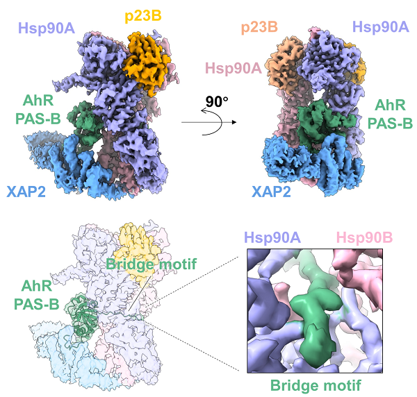芳香烃受体AhR是一种依赖于配体激活的转录因子,属于bHLH-PAS家族蛋白,包含bHLH、PAS-A、PAS-B等结构域。其中,PAS-B结构域拥有一个可以结合配体的口袋,负责AhR对不同信号刺激的响应。AhR可以被多种信号激活,在细胞毒性调节,细胞增殖分化,神经发育,免疫应答等多种生理学过程都发挥重要的作用。在AhR经典信号通路中,AhR首先与分子伴侣Hsp90,共分子伴侣p23,以及AhR结合蛋白XAP2形成静息态胞质复合物,当AhR识别配体后,激活相应的信号通路,调控下游基因的表达。长久以来,AhR如何与Hsp90、p23、XAP2等蛋白组装形成胞质复合物这个关键科学问题一直有待解决。