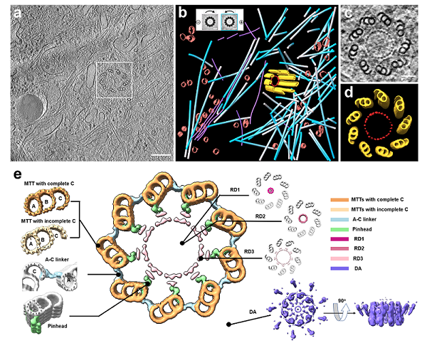 图2.(a)精准靶向中心体的冷冻含水切片透射电镜图;(b-e) 人体中心粒的原位结构。中央大图展示冷冻电子断层扫描成像技术解析获得的人中心粒横截面图。MTTs,微管三联体;RD1-3,中心粒内部环状密度;DA,远端附属结构。A-C linker,A管C管连接区。Pinhead,针头状结构。