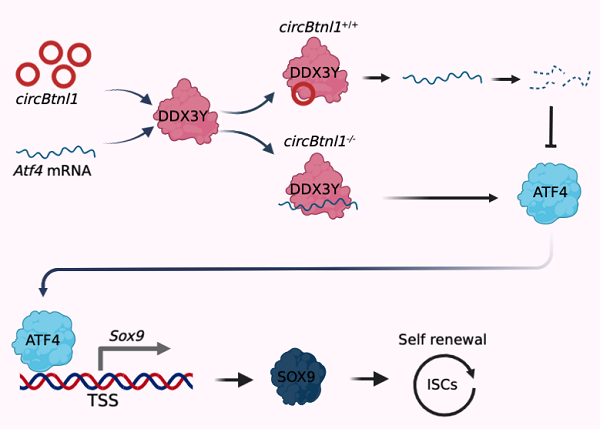 在该研究中,我们发现circBtnl1敲低能够促进肠道干细胞的增殖和类器官的生长。我们构建了circBtnl1敲除小鼠,发现circBtnl1缺失后小鼠肠道隐窝和肠绒毛明显增多,肠道干细胞的数目也显著增多。同时,circBtnl1敲除后并不影响其母基因Btnl1的mRNA和蛋白水平的表达,表明circBtnl1通过一种不依赖于Btnl1 mRNA和蛋白的方式调节肠道干细胞的自我更新能力。在稳态情况下,circBtnl1和RNA解旋酶Ddx3y竞争性结合转录因子Atf4的mRNA,进而抑制Atf4 mRNA的稳定性,继而抑制干性因子Sox9的转录表达,抑制肠道干细胞的再生能力,首次揭示circBtnl1对肠道稳态的负性调节作用。总之,该研究揭示了非编码RNA circBtnl1负向调控肠道干细胞自我更新的新机制,发现了Atf4/Sox9信号参与干性稳态维持的新功能,为解析肠道干细胞的稳态调控机制提供了新视角。