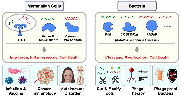 宿主细胞依赖多种免疫应答机制来对抗病毒感染。其中,针对核酸分子的免疫识别和操作,是极为核心的抗病毒免疫策略,其广泛存在于从细菌到哺乳动物等几乎所有宿主系统中(图-1)。相较于哺乳动物细胞稍显复杂的信号转导和调控,细菌往往更为简单高效,其编码的多种抗病毒免疫系统可直接对核酸分子进行切割或修饰(图-1)。这种特点也使得细菌免疫系统被广泛用于多种生物学工具的开发(如R-M和CRISPR-Cas等),极大促进了整个生命医学领域的发展。