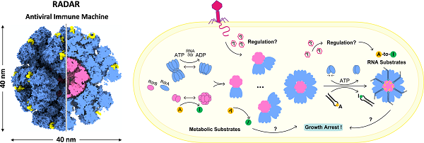 2023年2月9日,中科院生物物理研究所高璞团队在《Cell》在线发表题为 "Molecular basis of RADAR anti-phage supramolecular assemblies" 的文章,发现了RADAR不同组分间的互作关系,揭示了其通过形成新型超分子复合体来实现RNA装载、运输和脱氨修饰的精妙偶联机制,拓展了我们对细菌-病毒博弈复杂性的理解,并为开发基于RADAR的多种生物学工具提供了思路。
