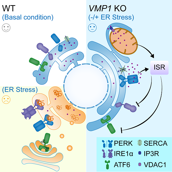 左上,在本底条件下,野生型细胞的三条UPR通路处于关闭状态。左下,在内质网应激的状态下,野生型内质网腔内的未折叠蛋白会激活三条UPR信号通路。右边,在VMP1蛋白缺失的细胞中,钙离子会直接激活PERK信号通路。而PERK信号通路的激活以及线粒体损伤会抑制内质网应激诱导的IRE1α和ATF6信号通路的激活。