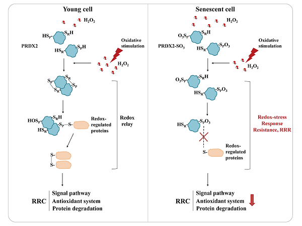 衰老与氧化还原应激密切相关。自由基衰老学说认为自由基对大分子氧化损伤导致衰老,然而半个多世纪以来抗氧化延缓衰老临床应用仍是挑战,提醒我们重新审视自由基衰老学说。过去大多数关于氧化还原和衰老的研究主要集中在静息状态活性氧的高低。很少关注对氧化还原刺激的动态反应能力。金沙集团1862cc陈畅课题组在前期研究中提出氧化还原应激反应能力(Redox-stress Response Capacity, RRC)的新概念(Redox Biol., 2017),并发现RRC下降是衰老的一个本质特征。那么衰老为什么RRC下降呢?陈畅课题组最新研究发现在衰老细胞或线虫个体中存在一种类似胰岛素抵抗的"氧化还原应激响应抵抗(Redox-stress Response Resistance, RRR)"现象,并揭示PRDX2过氧化导致RRR的新机制。相关研究论文近日发表在Science China Life Science杂志。