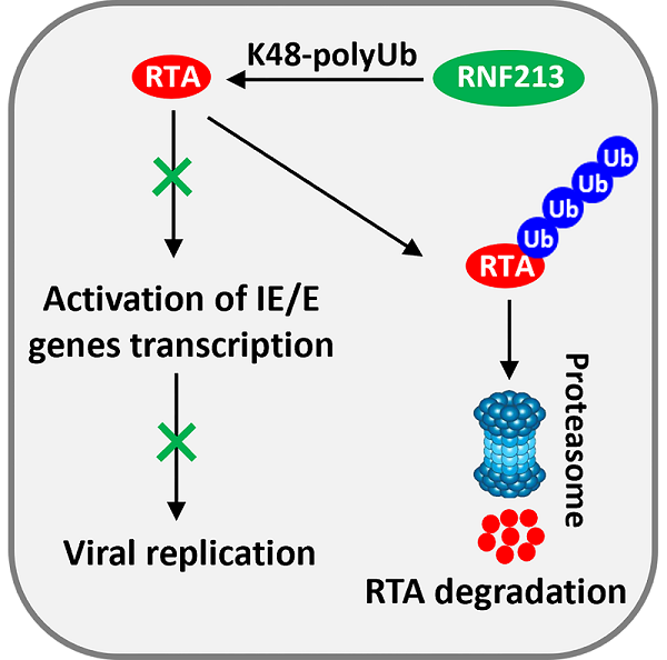 综上所述,该工作首次鉴定了干扰素诱导基因RNF213抑制γ疱疹病毒复制的功能,揭示了RNF213与病毒"分子开关"蛋白RTA互作并介导RTA泛素化修饰和降解的分子机制。该工作将有助于我们理解天然免疫尤其是干扰素如何调控γ疱疹病毒潜伏感染和裂解复制,为有效防控病毒感染提供了新思路。