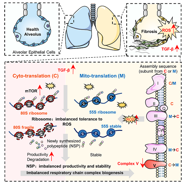 两种翻译系统的蛋白质产物的量和稳定性不同,导致核和线粒体编码的呼吸链复合物亚基的表达失衡,特别是complex V。吡非尼酮的治疗挽救了complex V功能,从而抑制了TGF-β诱导引起的肺纤维化。