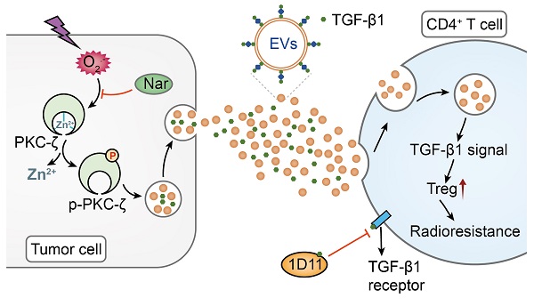 图1:乳腺癌放疗微环境TGF-β1EV的分子调控机制:放射治疗激活肿瘤细胞的超氧化物-锌离子-PKC-ζ-TGF-β1EV通路,携带TGF-β1的囊泡胞外释放后被CD4+ T靶细胞内吞,激活TGF-β1胞内信号通路,分化为Treg,引起肿瘤的放疗抵抗。Nar通过抑制肿瘤细胞活性氧水平,降低PKC-ζ的磷酸化化水平,抑制携带TGF-β1的囊泡的分泌,达到降低放疗抵抗的目的。而1D11与游离TGF-β1结合,不能阻断TGF-β1EV的信号通路,无法发挥其与放疗联合的优势。