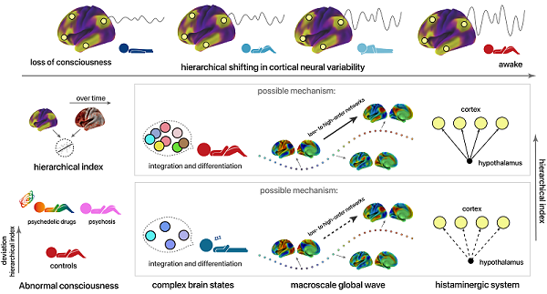 研究人员首先发现全局意识状态的改变伴随着脑自发活动可变性的显著变化,这种变化空间上形成了从初级皮层,到额顶、默认等高级功能网络的连续拓扑特征,因此假设:脑的时空(时域的脑自发活动可变性与空域的脑层级化拓扑组织模式)嵌套表征可能反映当前大脑系统的意识状态水平,更高的意识状态需要更多地向高层级脑区灵活性配置。利用这一思想,研究人员发展了时空嵌套表征的个体化动态定量指标-层级分数,并发现这一指标:可在个体水平区分清醒、麻醉与恢复等不同的意识状态;可在个体水平动态捕捉到不同的睡眠分期,与人类专家标注的睡眠深度高度吻合;可捕捉到传统静息态扫描中被试困倦的状态,与睡眠质量、反应速度以及任务准确率等相关;可有效鉴别同一个体何时位于较高的"能量状态",且与个体自主报告的注意力、困倦水平显著相关。研究人员发现相比于安慰剂,致幻剂可以引起志愿者层级分数的显著升高;在跨诊断精神疾病患者中层级分数与阳性症状显著正相关,尤其是非常规思维、幻觉、定向力丧失等有关,提示该时空嵌套表征的偏离可能帮助理解异常意识状态的神经机制。