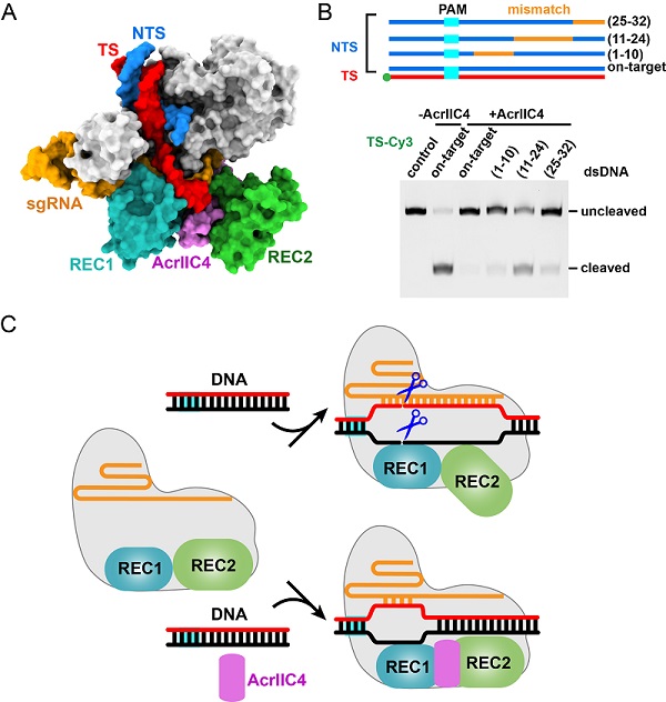 针对上述科学问题,该研究解析了Cas9,向导RNA (sgRNA),AcrIIC4和靶标DNA之间的一系列结构,发现AcrIIC4结合到Cas9的两个识别结构域REC1和REC2之间,并与sgRNA建立了广泛相互作用,这样能限制住柔性较大的REC2结构域的运动(图A)。结构比较发现,有AcrIIC4存在时,靶标链(TS)和sgRNA只能形成七个碱基的异源双链配对,R-loop的形成被阻止在中间步骤。这与生化实验证据相印证:AcrIIC4能降低、但不完全阻止Cas9与DNA的结合。进一步的实验证明,AcrIIC4能阻止双链DNA在PAM远端解链(图B),并对TS-guide RNA结合通道的形成有影响,从而阻止完整R-loop的形成,终止后续别构激活(图C)。此外,AcrIIC4抑制II-C型Cas9不同同源蛋白的能力差异较大。该研究通过一级序列和三维结构比对,结合体外切割实验,证明了sgRNA的第一个茎环长度的不同是导致这种差异的原因。这一发现对在不同Cas9编辑系统中应用AcrIIC4具有指导意义。