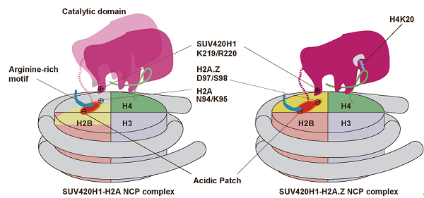 图1:SUV420H1与H2A.Z/H2A核小体和复合物结构示意图