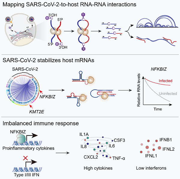 研究团队利用实验室前期开发的RNA原位构象测序技术RIC-seq(Nature, 2020),绘制了SARS-CoV-2感染细胞和病人肺部组织内的RNA-RNA互作图谱。基于该图谱,发现SARS-CoV-2病毒进入宿主细胞后,其RNA结构会发生显著变化,进而与宿主mRNA发生广泛的相互作用,并形成RNA双链体。利用全转录组范围内的稳定性测序技术,发现在病毒感染之后,与SARS-CoV-2 RNA互作的宿主mRNA稳定性大幅提高,导致包括NFKBIZ、KMT2E等mRNA的半衰期显著延长,从而翻译产生更多蛋白质。进而发现RNA结合蛋白YBX3可结合在SARS-CoV-2 RNA与宿主mRNA 3' UTR区形成的双链体,从而稳定宿主mRNA分子。在数百个表达显著提高的蛋白中,NFKBIZ发挥了抑制I型和III型干扰素表达,同时促进IL6、IL8等众多炎症因子产生的作用,从而诱发炎症风暴的形成。