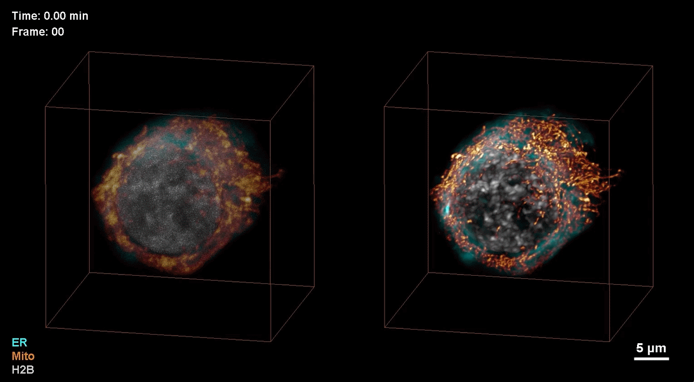 (3)对Hela细胞有丝分裂完整过程进行三维三色超分辨实时成像,揭示线粒体与内质网的三维相互作用以及核斑的时空演化规律。
