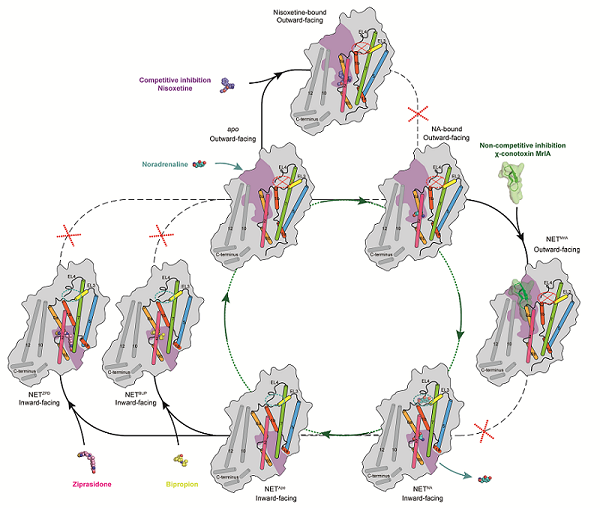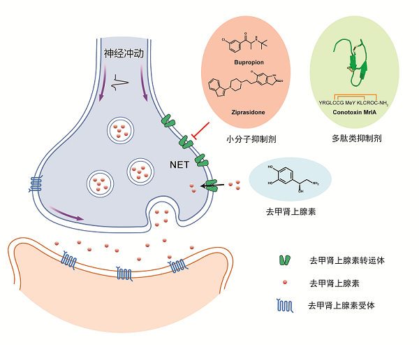 去甲肾上腺素(Noradrenaline,NA)是神经系统中重要的单胺类神经递质。在中枢神经系统中,去甲肾上腺素能神经元起始于脑干中一个名为"蓝斑核"的细胞核团,并广泛投射至大脑的其他区域,调节情绪、注意力、记忆、性欲等多种神经活动。此外,NA在背根神经节能够与伤害传入神经元上的α2A受体结合,抑制疼痛信号的传递。在去甲肾上腺素能神经元中,NA由突触前膜释放到突触间隙,激活去甲肾上腺素受体,进而启动一系列信号传导过程。定位于突触前膜上的去甲肾上腺素转运体(NET),通过利用细胞内外存在的钠离子和氯离子的浓度梯度,可以将NA重新摄取回突触前神经元内,进而终止神经信号的传递。NET对于NA的回收维持了神经系统中NA水平的平衡,使得神经系统能够正常行使生理功能。目前,临床上有多种小分子药物通过抑制NET 来提高突触间隙 NA 的浓度,进而增强去甲肾上腺素能神经元的信号传递,从而治疗抑郁症、注意力缺陷多动障碍等疾病。此外,多肽类毒素χ-MrA能以非竞争方式特异地抑制 NET,通过提高伤害传入神经元的 α2A 受体活性,阻断疼痛信号的传递,展现出显著的镇痛效果。然而,目前对于 NET转运底物以及与不同药物分子结合模式仍不清楚。
