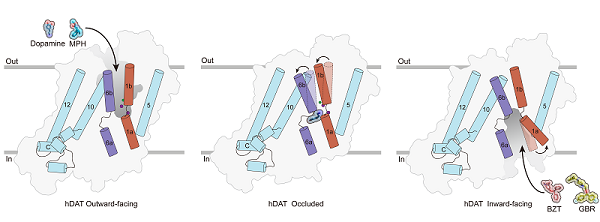图3. 人源DAT底物转运模型及药物分子抑制机制