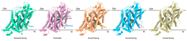 图2. 人源DAT天然状态、结合底物多巴胺和三种抑制剂复合物的冷冻电镜结构